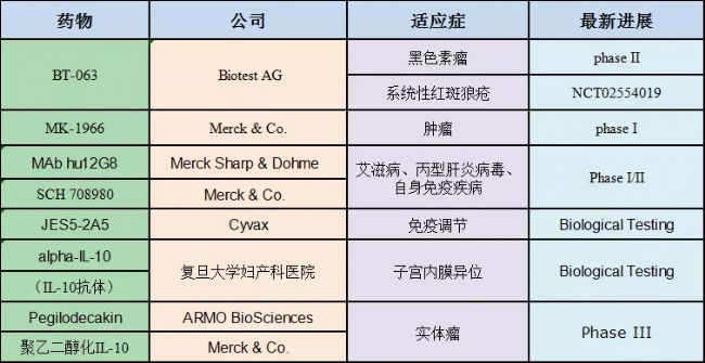 IL-10相關(guān)的主要研藥物見(jiàn)下表,其主要是形式有IL-10融合蛋白、聚乙二醇化IL-10和腺病毒三種,適應(yīng)癥包括腫瘤、腸炎,只有Pegilodecakin進(jìn)入臨床階段。Pegilodecakin抗腫瘤的原理是IL-10能夠促進(jìn)人體免疫系統(tǒng)中稱為CD8+ T免疫細(xì)胞的存活、擴(kuò)增和殺傷力(細(xì)胞毒性)。CD8+ T細(xì)胞可以識(shí)別和殺死癌細(xì)胞,促進(jìn)增加腫瘤內(nèi)CD8+ T細(xì)胞水平,可能改善患者的預(yù)后和生存。