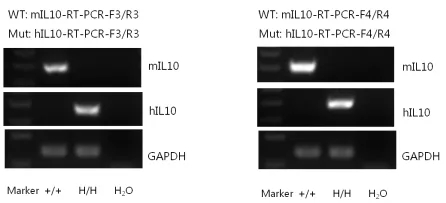 圖1. 純合B-hIL10 mice脾細(xì)胞中可檢測(cè)到人源IL10 mRNA,檢測(cè)不到鼠源IL10 mRNA。