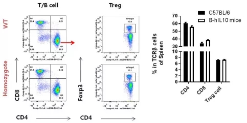 流式細(xì)胞術(shù)檢測(cè)野生型C57BL/6小鼠和B-hIL10小鼠(n=3)脾臟淋巴細(xì)胞中的T細(xì)胞亞群比例。結(jié)果顯示純合B-hIL10小鼠與野生型C57BL/6小鼠淋巴細(xì)胞亞群有相似分布,說(shuō)明其T細(xì)胞分化未受到IL10人源化影響。