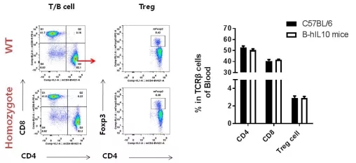 流式細(xì)胞術(shù)檢測(cè)野生型C57BL/6小鼠和B-hIL10小鼠(n=3)血液淋巴細(xì)胞中的T細(xì)胞亞群比例。結(jié)果顯示純合B-hIL10小鼠與野生型C57BL/6小鼠淋巴細(xì)胞亞群有相似分布,說(shuō)明其T細(xì)胞分化未受到IL10人源化影響。
