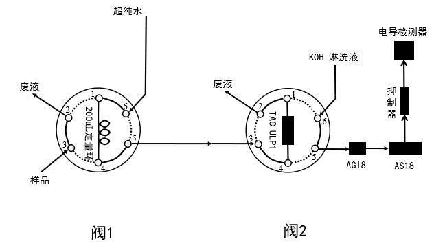 以純水為媒介,將樣品從樣品閥(閥1)完全轉載入富集閥(閥2),待測化合物被富集于離子濃縮柱上,而樣品基質則流入廢液。隨后,富集柱被切換進入色譜分離系統(tǒng),完成待測化合物的分離測定。