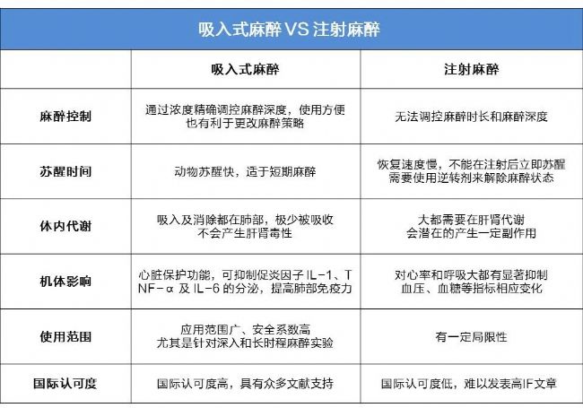 動(dòng)物注射麻醉難以精確調(diào)控麻醉時(shí)長(zhǎng)和麻醉深度,其麻醉藥物大都在體內(nèi)有一定殘留,且對(duì)心血管呼吸系統(tǒng)有明顯抑制作用,肝腎毒性較大,目前正一步步地被吸入性麻醉所取代。吸入性麻醉相較于注射麻醉,有如下特點(diǎn):