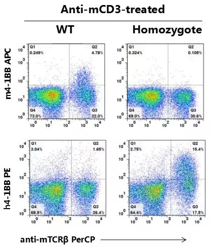結(jié)果顯示:在C57BL/6小鼠中可檢測(cè)到m4-1BB+細(xì)胞。在B-hPD-1/h4-1BB純合鼠中,可檢測(cè)到h4-1BB+細(xì)胞。