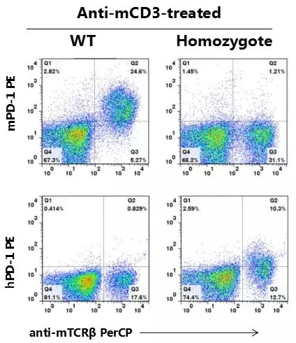 結(jié)果顯示:在C57BL/6小鼠中可檢測(cè)到mPD-1+細(xì)胞。在B-hPD-1/h4-1BB純合鼠中,可檢測(cè)到hPD-1+細(xì)胞。