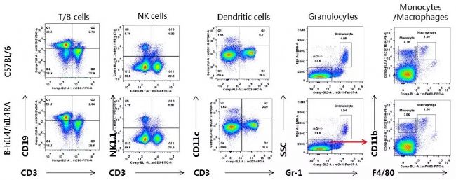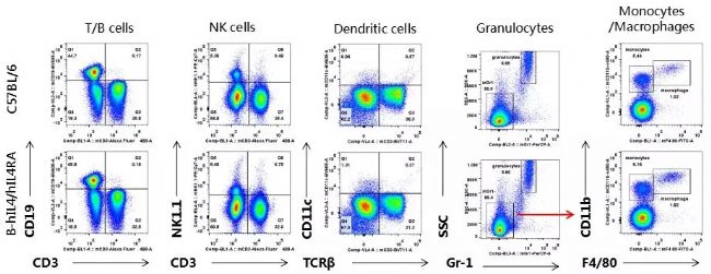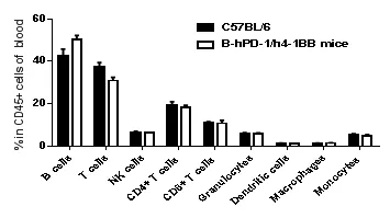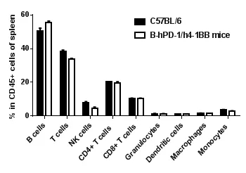 流式細(xì)胞術(shù)檢測(cè)野生型C57BL/6小鼠和B-hPD-1/h4-1BB小鼠(n=3)血液免疫細(xì)胞分型,結(jié)果顯示:純合B-hPD-1/h4-1BB小鼠免疫細(xì)胞分型與野生型小鼠相似。說(shuō)明其T、B、NK、DC、粒細(xì)胞、單核細(xì)胞、巨噬細(xì)胞的分化未受到PD-1和4-1BB基因人源化的影響。