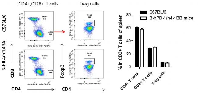 流式細(xì)胞術(shù)檢測(cè)野生型C57BL/6小鼠和B-hPD-1/h4-1BB小鼠(n=3)血液淋巴細(xì)胞中的T細(xì)胞亞群比例。結(jié)果顯示:純合B-hPD-1/h4-1BB小鼠與野生型C57BL/6小鼠淋巴細(xì)胞亞群有相似分布,說(shuō)明其T細(xì)胞分化未受到PD-1和4-1BB基因人源化的影響。