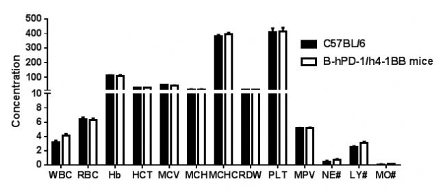 血常規(guī)檢測(cè)野生型C57BL/6小鼠和B-hPD-1/h4-1BB小鼠(n=3)。結(jié)果顯示:純合B-hPD-1/h4-1BB小鼠與野生型C57BL/6小鼠血常規(guī)檢測(cè)值相似。