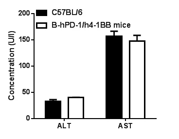 血生化檢測(cè)野生型C57BL/6小鼠和B-hPD-1/h4-1BB小鼠(n=3)。結(jié)果顯示:純合B-hPD-1/h4-1BB小鼠與野生型C57BL/6小鼠血常規(guī)檢測(cè)值相似。