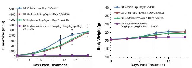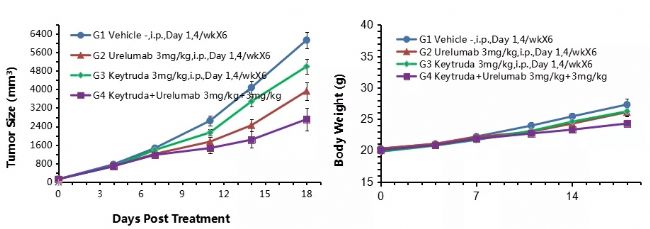 結(jié)果顯示:聯(lián)合應(yīng)用抗人PD-1抗體Keytruda和抗人4-1BB抗體Urelumab 對(duì)腫瘤生長(zhǎng)的抑制作用強(qiáng)于分別單用兩種抗體藥的藥效。A. 腫瘤平均體積±SEM,B. 小鼠平均體重±SEM。結(jié)果證明:B-hPD-1/h4-1BB純小鼠是評(píng)估聯(lián)合應(yīng)用人PD-1和人4-1BB抗體體內(nèi)藥效的有力工具。