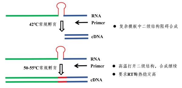 常規(guī)反轉(zhuǎn)錄酶發(fā)揮作用的最佳溫度在42℃左右,但常規(guī)溫度很難打開復(fù)雜模板中的二級結(jié)構(gòu),直接阻礙cDNA的繼續(xù)合成;選擇熱穩(wěn)定性高的反轉(zhuǎn)錄酶,可以在高溫打開復(fù)雜模板中二級結(jié)構(gòu)的同時發(fā)揮作用,極大的提高了復(fù)雜模板的反轉(zhuǎn)錄效率(圖3)。