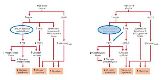 胰島素是機體調節(jié)血糖吸收、促進合成代謝(anabolic metabolism)最關鍵的激素,可以促進糖原、脂肪、蛋白質合成。糖原和脂肪可被用于能量貯存;糖原是最先被機體利用的能量儲備:比如在運動時,肌肉糖原可以作為快速的能量來源,供肌肉細胞產生ATP;而肝臟中糖原負責在饑餓或能量缺乏時補充血糖,使之維持穩(wěn)定濃度。但是糖原代謝里一個長期懸而未決的問題,胰島素是如何激活糖原合成的?甚至在最新版(第七版)的Lehninger生化教科書中,也只是指出需要一個“insulin-sensitive protein kinase”,但不知其身份。雖然胰島素-AKT可以通過抑制激酶GSK3、降低糖原合成酶GS磷酸化來促進糖原合成,但是這條調節(jié)通路的作用非常有限,因為GSK3的磷酸化位點突變后不影響糖原合成。并且,GSK3調控糖原合成是通過雙抑制作用而起作用,目前我們的認識里還缺乏一種主動糖原合成調控的機制。雖然已知胰島素還通過激活磷酸酶PP1,進而調節(jié)多個關鍵糖原代謝酶,然而由于對phosphatase調節(jié)研究的困難,領域內只能猜測卻難以發(fā)現這個調節(jié)PP1磷酸酶的“insulin-sensitive protein kinase”。