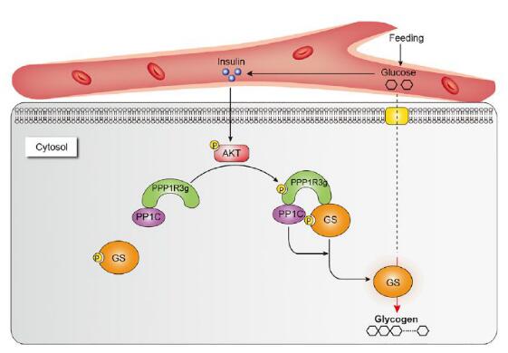 PP1(protein phosphatase1)對糖代謝具有重要作用,參與調節(jié)多個糖原代謝酶活性,包括GS、GP和GPK。PP1全酶由一個催化亞基(PP1c)和一個調節(jié)亞基(PPP1R)組成。已知PPP1R3家族作為特殊的一類調節(jié)亞基可以把PP1靶向到糖原代謝過程,該家族包括7個成員,PPP1R3a-g。盡管一些研究表明PPP1R3成員參與調節(jié)肝臟糖原合成和積累,但是具體的機制究竟是如何呢?