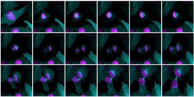 ▲圖 2.12 h confocal time-lapse video of dividing RPE cells stably expressing eGFP-tubulin (cyan) and mRFP-Histidine H2B (magenta). Courtesy of C. Gliech, Holland Labs, John Hopkins School of Medicine, US