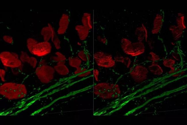 ▲圖 6.Whole mount mouse diaphragm muscle was stained for nicotinic acetylcholine receptors, a principal postsynaptic component of neuromuscular junctions (red) and tyrosine hydroxylase, a marker for sympathetic neurones (green). Courtesy of Tatjana Straka and Rüdiger Rudolf, University of Applied Science, Germany