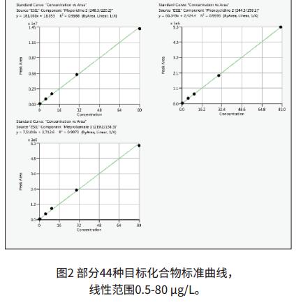 圖1中展示了采用目標化合物濃度為10.0µg/L的提取離子色譜圖。各個化合物的峰型對稱,獲得優(yōu)異的色譜分離效果,僅需4.5 min即可完成目標化合物的分離,大大提高分析效率。