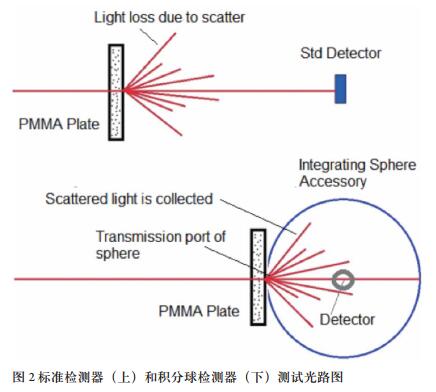 樣品一般為片狀小孔,測(cè)試樣品反射時(shí),除了鏡面反射,還會(huì)存在大量漫反射信號(hào);測(cè)試樣品透射時(shí),除了垂直透射信號(hào),也會(huì)存在大量散射信號(hào)。若采用標(biāo)準(zhǔn)檢測(cè)器時(shí),只能收集其中一部分光,無(wú)法檢測(cè)到散射信號(hào),測(cè)試結(jié)果不準(zhǔn)確。此時(shí)采用積分球檢測(cè)器,可以收集樣品反射或者透射所有光譜信號(hào),測(cè)試結(jié)果更加準(zhǔn)確,見(jiàn)圖 2。