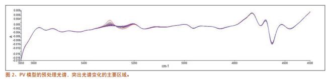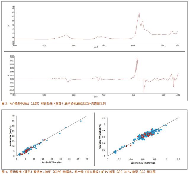 使用低光降噪的一階導(dǎo)數(shù)基線校準(zhǔn)模型對(duì)收集到的所有光譜進(jìn)行預(yù)處理。在 AV 模型中,光譜區(qū)域 5860–5650cm-1 吸光度值超過(guò)了 2.5 的吸光度閾值上限,因此不做建模計(jì)算。在 PV 校準(zhǔn)模型中,光譜范圍經(jīng)調(diào)整后僅包括 5650–4500 cm-1 區(qū)域,因?yàn)榇藚^(qū)域顯示了大多數(shù)光譜變化,具體如圖 2 所示。圖 3 顯示了 AV 模型中原始和預(yù)處理后的油炸棕櫚油光譜。