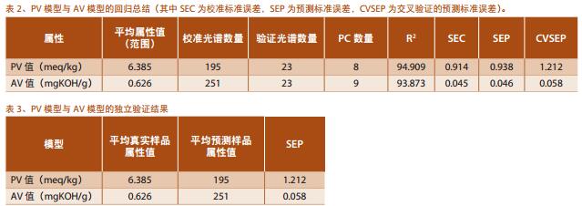 我們通過(guò)珀金埃爾默 Spectrum Quant™ 軟件建立了 PV和 AV 的偏最小二乘(PLS1)校準(zhǔn)模型。對(duì)樣品進(jìn)行分割,其中, 195 張光譜用于建立 PV 校準(zhǔn)模型, 23 張光譜用于模型的獨(dú)立驗(yàn)證。在 AV 模型中, 226 張光譜作為校準(zhǔn)樣品,而 PV 模型中所用的 23 張光譜則用于獨(dú)立驗(yàn)證。我們對(duì)所有模型進(jìn)行了交叉驗(yàn)證。對(duì) PV 模型,將光譜分為 20 份,進(jìn)行隨機(jī)交叉驗(yàn)證。對(duì) AV 模型,將光譜分為 10 份,進(jìn)行順序交叉驗(yàn)證。