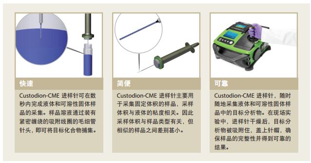 Custodion ® 微萃取(CME)進樣針主要用于現(xiàn)場液體樣品采樣以及氣相色譜(GC)進樣。與 Torion ® T-9 便攜式 GC/MS 系統(tǒng)聯(lián)用時, Custodion-CME 進樣針可快速、簡便、可靠地采集和分析現(xiàn)場液體樣品。