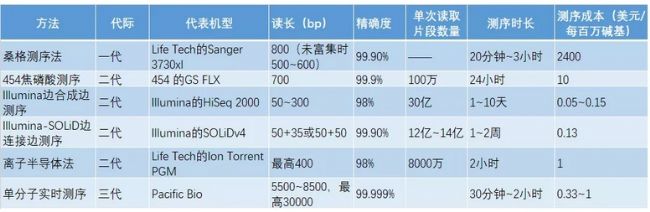 測(cè)序成本:通常按每百萬堿基對(duì)(Mbp)的成本來衡量,桑格測(cè)序法的成本為2400美元/Mbp,454公司將成本降至10美元/Mbp,而Illumina的測(cè)序成本則降至0.05美元/Mbp。
