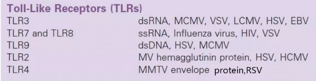 不同的TLR分子識(shí)別特定的病毒產(chǎn)物,如單鏈和雙鏈RNA(TLR3和TLR7/8)或雙鏈DNA(TLR9),如下圖: