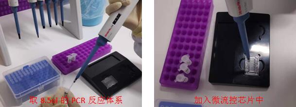 A.在PCR實驗室一區(qū)(試劑配制區(qū))進行操作:按照試劑說明書配液比例配制相應檢測人份數的PCR反應體系,混勻離心后,向微流控芯片各孔中分別加入8.5uL PCR反應體系(包括引物探針Mix,PCR緩沖液,酶混合液)