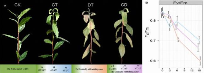 案例2:2016年發(fā)表的”Global Transcriptional Analysis Reveals the Complex Relationship between Tea Quality, Leaf Senescence and the Responses to Cold-Drought Combined Stress in Camellia sinensis”一文中,對(duì)茶樹分別進(jìn)行正常溫度正常水分、逐漸降溫、逐漸干旱、降溫同時(shí)干旱四種處理,分析其Fv/Fm隨降溫或缺水均逐漸降低,且干旱處理下Fv/Fm降低最明顯,低溫處理對(duì)Fv/Fm的影響相較最小。