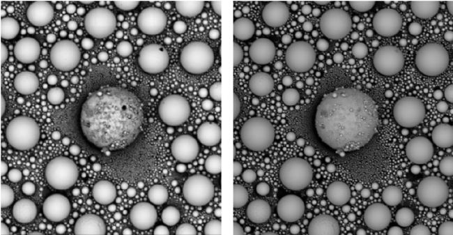 錫球樣品在 5kV(左圖) 和 15kV (右圖)的背散射(BSE)圖像。低加速電壓下,樣品表面的碳污染清晰可見。當(dāng)電壓增加時(shí),樣品內(nèi)部結(jié)構(gòu)逐漸得以顯露。