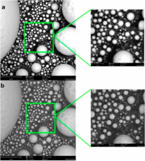 使用掃描電鏡對(duì)錫球進(jìn)行成像,a)大光斑 b) 小光斑。左邊顯示的是低倍率圖像,右邊顯示的是各自的高倍率圖像。在低倍放大時(shí),采用高電流(a)。在高倍放大圖像的情況下,使用較小的光斑,實(shí)現(xiàn)更好的空間分辨率。