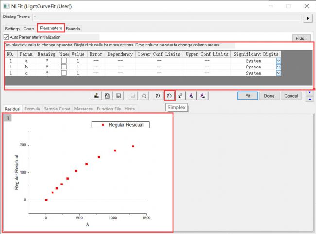 點擊并切換至Parameters窗口,點擊Simplex擬合,直至Parameters內(nèi)參數(shù)不變,點擊Fit完成擬合。