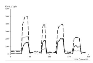 4 個(gè)受試者個(gè)體的單次呼出氣濃度輪廓曲線:顯示的是丙酮 (虛線), 異戊二烯 (黑線) 和乙醇 (灰線) 的數(shù)據(jù)