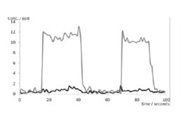 采用 SIFT-MS 對(duì)單次呼出氣的分析:顯示的是氰化氫 (灰線) 和硫化氫 (黑線) 的數(shù)據(jù)