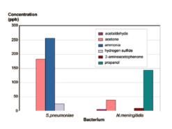 揮發(fā)性有機(jī)化合物 (VOCs) 和某些無(wú)機(jī)氣體 (如一氧化氮, NO) 是生物體中各種新陳代謝過(guò)程的副產(chǎn)物。在特定條件下,將病體排放的這些化合物濃度輪廓圖與 ”健康正! 的群體相比較,就可以使用這些排放的化合物的變化作為病體的標(biāo)記物。我們已知的更好的實(shí)例包括人體呼出氣中顯示腎臟狀況的氨和胺的異味。