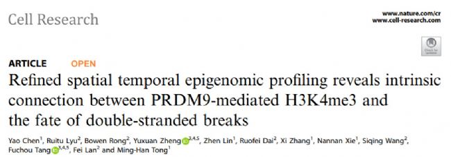 2020年2月11日,中科院分子細胞卓越創(chuàng)新中心(上海生物化學與細胞生物學研究所)童明漢課題組與復旦大學生物醫(yī)學研究院/附屬中山醫(yī)院藍斐課題組、北京大學湯富酬課題組合作在Cell Research上發(fā)表論文“Refined spatial temporal epigenomic profiling reveals intrinsic connection between PRDM9-mediated H3K4me3 and the fate of double-stranded breaks”。