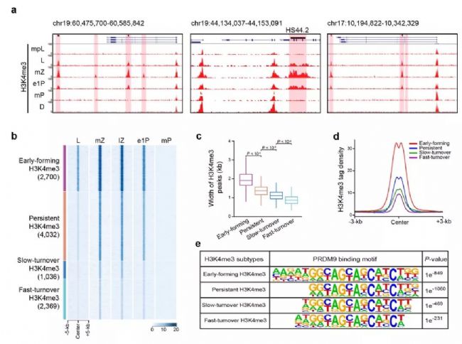 結果顯示,PRDM9介導的H3K4me3修飾在細線期(Leptotene)開始生成,至偶線期中期達到峰值,隨后逐步消失(圖2a);同時,越早產生的H3K4me3越晚消失。這種H3K4me3動態(tài)變化與DSB修復過程中同源重組中間產物的演變高度相關,提示PRDM9介導的H3K4me3可能參與了DSB修復過程。根據生成和消失時間,研究人員繼而將與重組熱點相關的H3K4me3分為四種類型,發(fā)現(xiàn)早期產生的H3K4me3信號強度與寬度均最強,且富集了更長的PRDM9結合基序(圖2b-e);那些快速消失的H3K4me3信號強度與寬度均最弱,且為較晚產生。這些結果表明早期生成的PRDM9介導的H3K4me3可能通過影響同源重組穩(wěn)定中間體dHJ(double Holliday Junction),從而進一步調控交叉形成;而那些弱而快速消失的則指導生成非交叉。