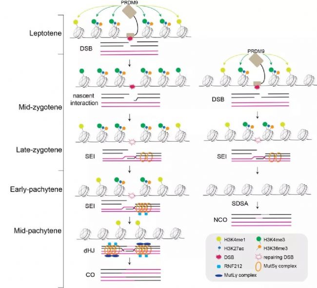 DSB位點并非隨機分布,而是具有明顯的偏好性,稱之為熱點(hotspot)。盡管已知PRDM9及其介導的H3K4me3修飾在在多數哺乳動物DSB熱點選擇中發(fā)揮著關鍵作用【3-5】,但是,關于PRDM9介導的H3K4me3在DSB修復過程中是如何演化的,PRDM9及其介導的H3K4me3是否參與調控DSB修復過程即同源重組命運決定,以及其它表觀修飾因子是否也在其中發(fā)揮作用,等等,目前均不清楚。因為難以獲取高純度的各種亞型的哺乳動物減數分裂前期I細胞,所以同源重組命運決定機制一直是哺乳動物減數分裂研究的難點和熱點。