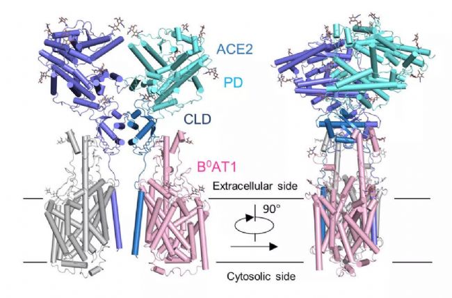 幾乎在同時(shí),西湖大學(xué)周強(qiáng)團(tuán)隊(duì)成功利用冷凍電鏡技術(shù)解析出此次新冠病毒的受體-ACE2的全長(zhǎng)結(jié)構(gòu)。這是世界上首次解析出ACE2全長(zhǎng)結(jié)構(gòu),和清華大學(xué)的研究結(jié)果相互補(bǔ)充和支持。(ACE2-B0 AT1復(fù)合物結(jié)構(gòu)圖)