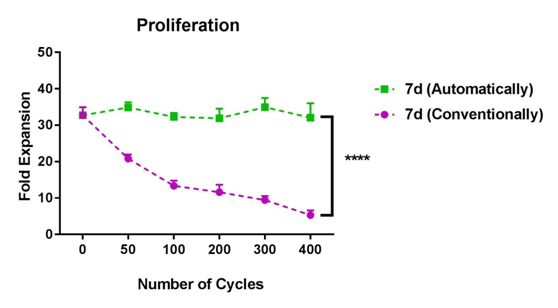 實驗證明:經(jīng)過400次存取后,原能細胞的BSN-500,可以有效避免在存取過程中的溫度波動,T cells仍有較好的增殖能力。而手動存取的T cells,會隨著提取次數(shù)的增加,細胞增殖能力顯著下降。