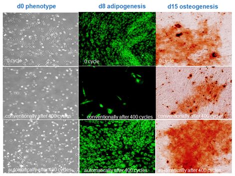 在本次實驗中,我們試了不同存取設(shè)備不同提取次數(shù)對臍帶來源的間充質(zhì)干細胞(UC-MSCs)多系分化潛能的影響。經(jīng)400次存取后,用成脂和成骨分化培養(yǎng)基誘導(dǎo),分別在培養(yǎng)至d8和d15用中性脂肪滴染色液和茜素紅染色并拍照。