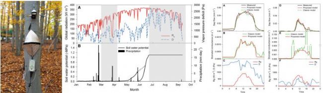 左圖:樹干莖流與樹干生長(zhǎng)監(jiān)測(cè);中圖:土壤水勢(shì)、太陽(yáng)輻射等氣象因子監(jiān)測(cè);右圖研究結(jié)果(引自:Jiri Kucera etc. Direct Penman-Monteith parameterization for estimating stomatal conductance and modeling sap flow, Trees, 2016.)