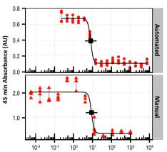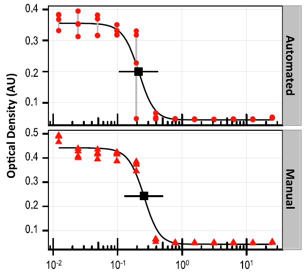 H3N2抑制物4等藥物篩選。自動(dòng)化實(shí)驗(yàn)和手工實(shí)驗(yàn)的IC50值高度一致。