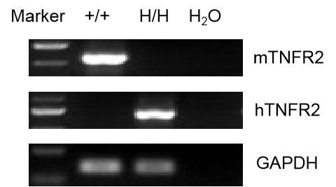 通過RT-PCR對WT和B-hTNFR2小鼠中TNFR2基因表達進行品系特異性分析。在C57BL/6小鼠中可檢測到mTNFR2 mRNA,而hTNFR2 mRNA僅在B-hTNFR2純合鼠中檢測到。