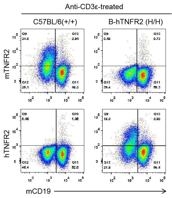 通過流式細胞術(shù)對野生型C57BL/6和B-hTNFR2純合鼠中TNFR2蛋白表達進行分析。用抗小鼠CD3ε抗體體內(nèi)刺激野生型C57BL/6和B-hTNFR2純合鼠,收集脾細胞,并用種屬特異性抗TNFR2抗體進行流式細胞術(shù)分析。結(jié)果顯示:在C57BL/6小鼠B細胞表面檢測到mTNFR2,在B-hTNFR2純合鼠B細胞表面檢測到hTNFR2。