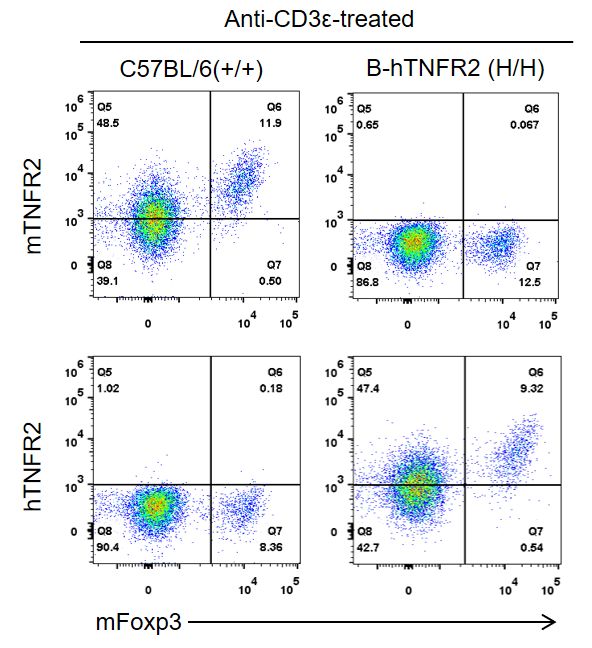 通過流式細胞術(shù)對野生型C57BL/6和B-hTNFR2純合鼠中TNFR2蛋白表達進行分析。用抗小鼠CD3ε抗體體內(nèi)刺激野生型C57BL/6和B-hTNFR2純合鼠,收集脾細胞,并用種屬特異性抗TNFR2抗體進行流式細胞術(shù)分析。結(jié)果顯示:在C57BL/6小鼠Treg細胞表面檢測到mTNFR2,在B-hTNFR2純合鼠Treg細胞表面檢測到hTNFR2。