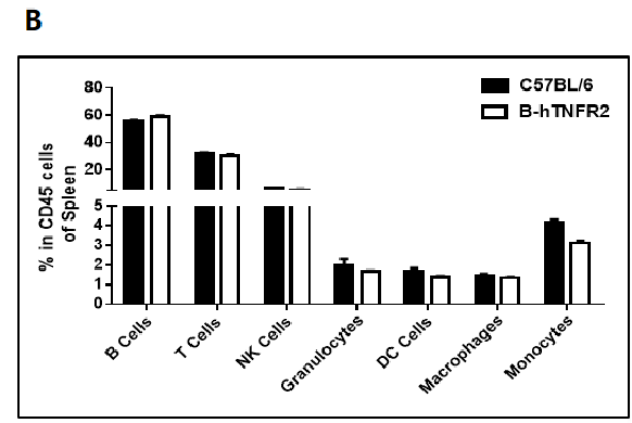結(jié)果表明,純合B-hTNFR2小鼠中白細胞亞群的表達譜與C57BL/6小鼠相似,hTNFR2的人源化不影響T,B,NK,粒細胞,單核細胞,DC和巨噬細胞的分化。