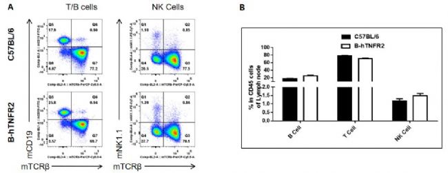 從C57BL/6和B-hTNFR2小鼠(n=3)中分離出淋巴結(jié)細胞。通過流式細胞術(shù)測試白細胞亞群的比例。結(jié)果表明,純合B-hTNFR2小鼠中白細胞亞群的表達譜與C57BL/6小鼠相似,hTNFR2的人源化不影響T,B,NK細胞的分化。