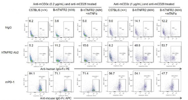 從anti-mCD3ε(0.2或1μg/mL)和anti-mCD28(1μg/mL)體內(nèi)刺激的B-hTNFR2小鼠分離出脾細胞。單個活細胞用CD45圈門后用于進一步的分析。如圖所示,與同型對照抗體(hIgG)相比,hTNFR2 Ab2與B-hTNFR2純合鼠的T細胞是結(jié)合的。在anti-mCD3ε(0.2μg /mL)刺激條件下,mTNFα增強了hTNFR2 Ab2與B-hTNFR2純合鼠的T細胞結(jié)合,這表明mTNFα/hTNFR2信號通路在B-hTNFR2純合鼠中是可行的。
