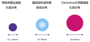 經(jīng)過(guò)絮凝處理后的料液,顆粒物直徑會(huì)提高2-4倍,往往會(huì)大于傳統(tǒng)深層過(guò)濾器的截留孔徑,容易造成濾器的迅速堵塞,載量降低。