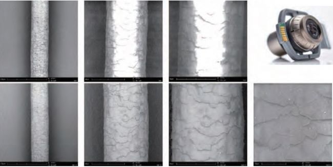圖 5. 普通模式觀察頭發(fā)(第一行);低真空模式觀察頭發(fā)(第二行);降低荷電樣品杯(右上)