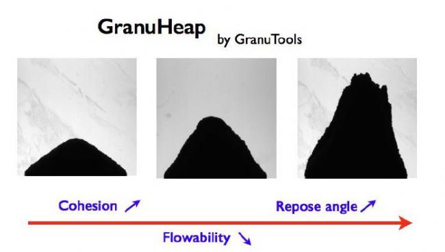 當(dāng)粉體被傾倒在平面時就會形成了堆狀。眾所周知,休止角和堆積形狀都與粉體特性密切相關(guān)。特別是粘性粉體會形成不規(guī)則的粉堆,而非粘性粉體形成規(guī)則的錐形粉堆。因此,精確地測量粉堆形狀能夠獲得粉體物理特性的有用信息。
